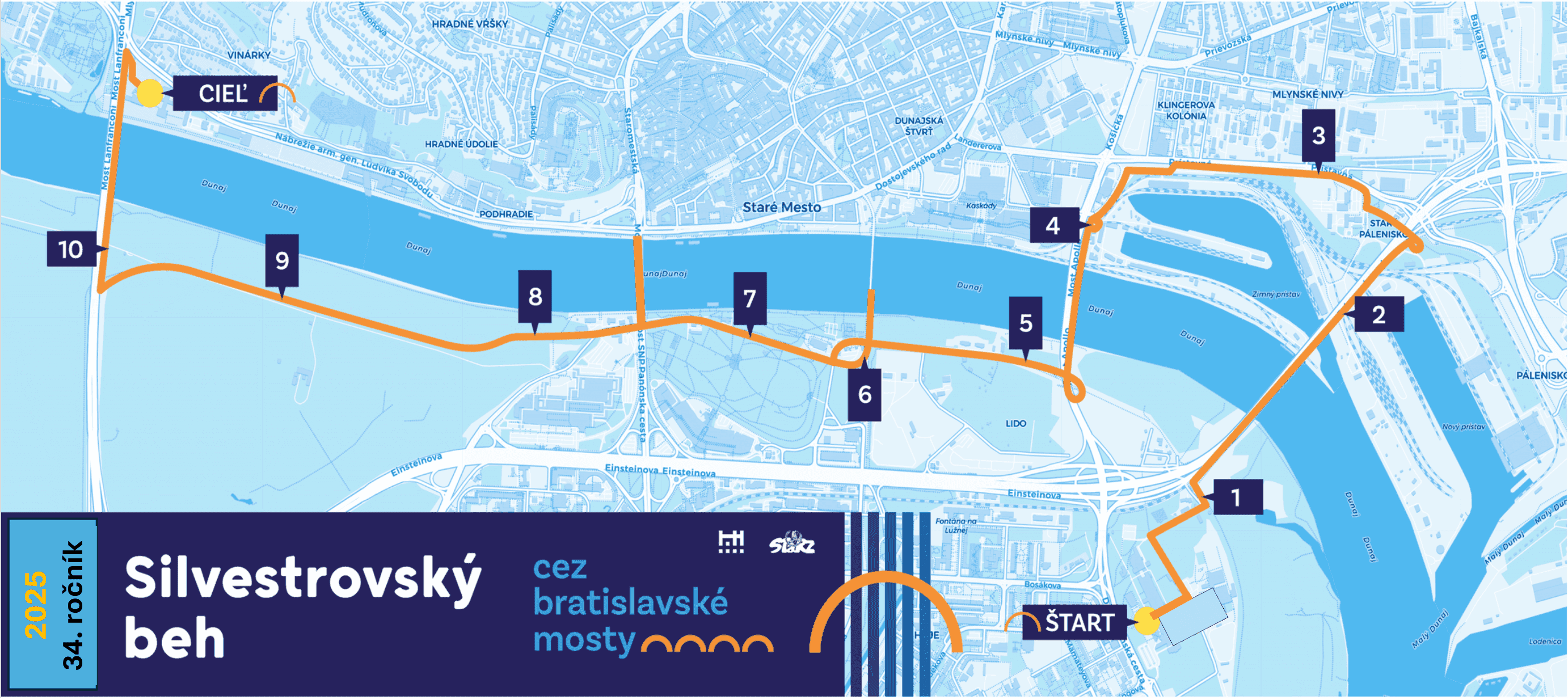 Trať 34. ročníka bude merať 11,5 km, pobeží sa cez päť mostov – Prístavný, Apollo, Starý, Nový a Lanfranconi – s cieľom na bežeckom ovále štadióna FTVŠ UK na Lanfranconi, kde sa uskutočnia detské súťaže SBCBM.